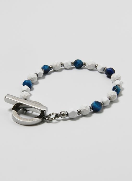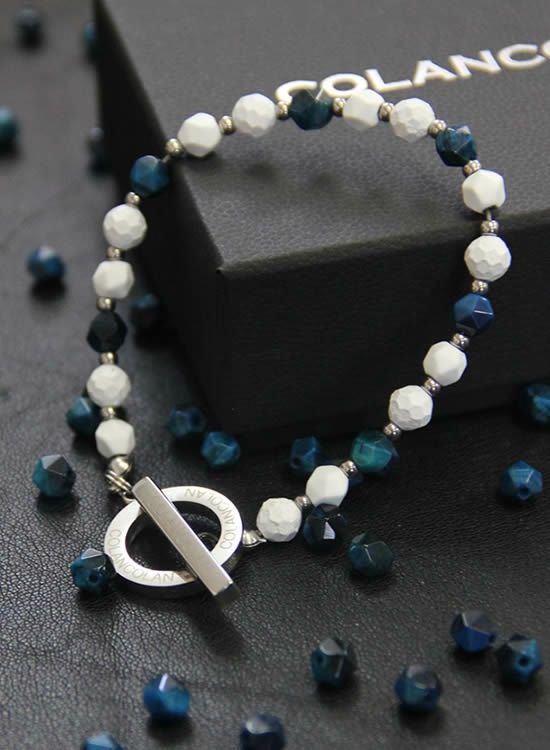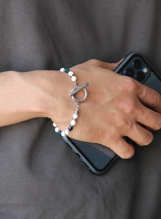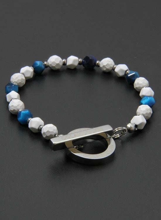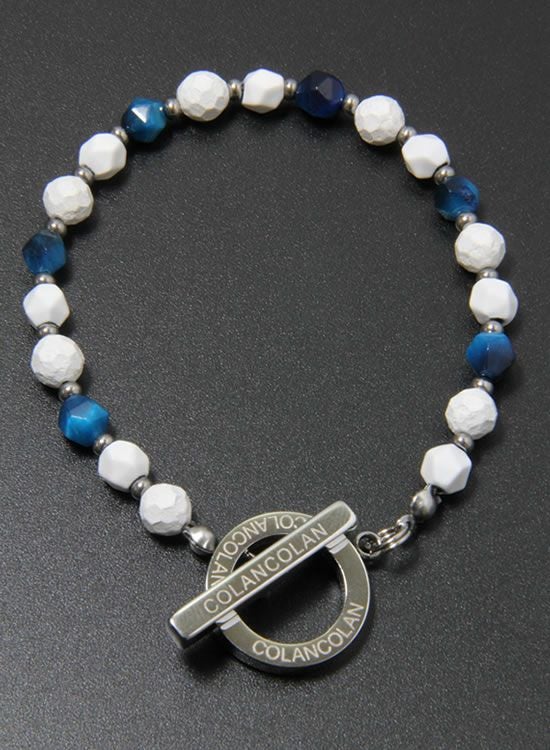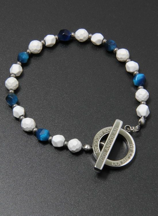 ホワイトの石にブルータイガーアイを組み合わせた【FORCE3ブレスレット】です。写真を良く見て頂くとわかるのですがコランコラン独自のマイナスイオンを放出する鉱石と天然石を交互に入れる事で光が当たった時の反射する角度が変わり、さらにブルータイガーアイの爽やかさをプラスした個性的なブレスレットになりました。