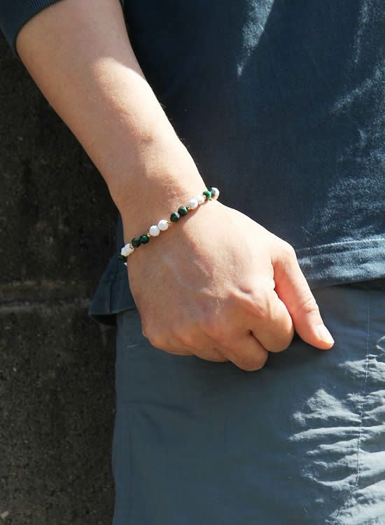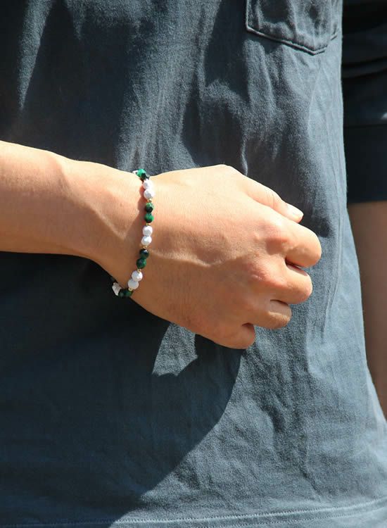 新しく角・グリーンタイガーアイを入手しましたのでブレスレットを作ってみました。従来の玉の配列を少し変えて2個ずつ配置してみました。チョット変えただけで見た目がガラッと変わるのがFORCEシリーズのオモシロイ所です!!ぜひ過去商品とも見比べてご検討頂ければ嬉しいです。