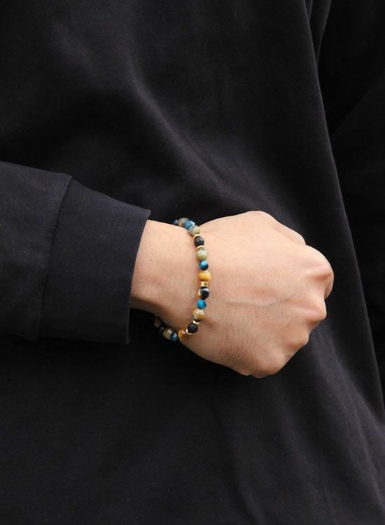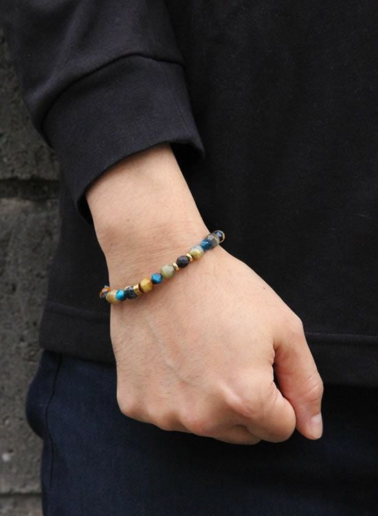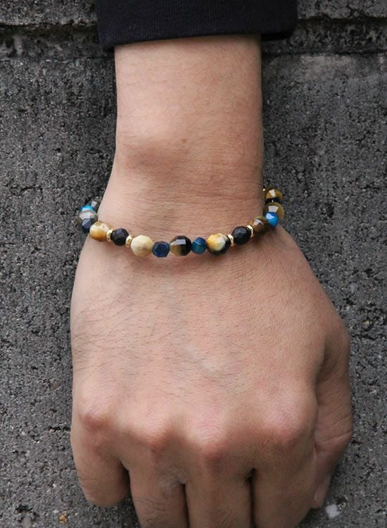 少し明るめのブレスレットを作りたくなって、今回は【8mmオーバル多面カットのMIXタイガーアイ】をメインに採用しました。全体的に明るいキレイなイエローが特徴的な石になります。これに人気の6mm角ブルータイガーアイを少し入れる事でブレスレットのデザインがキュッと締まり高級感も出るんですよ~。凄く使いやすいデザインに仕上がったと思います。