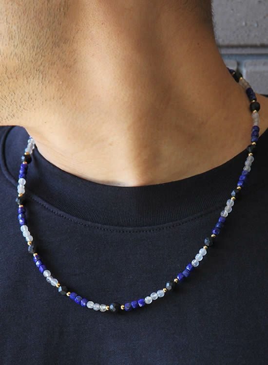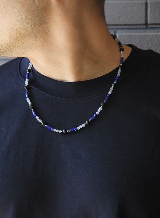秋冬はシンプルで細いネックレスを長めで着けるのはいかがでしょう?今回は55㎝で撮影してみました。4mmの石だけどラピスラズリはやっぱり存在感があるので細目だけどシッカリカッコイイです。