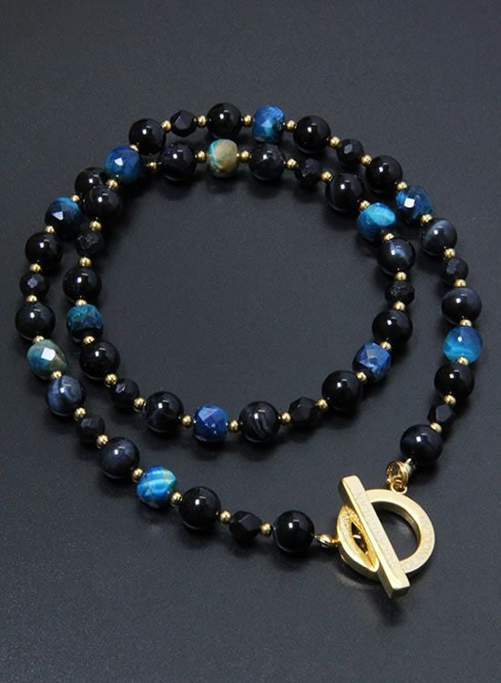 8mmブラックタイガーアイでネックレスを作ってみました。パッと見は黒い玉にしか見えないのですが少し明るい所にでればブルーが浮かび上がってくるのが特徴です。今回は多面体のブルータイガーと合わせてみました。ブラックの玉に多面体ブルータイガーが差し色になっていて素敵です。