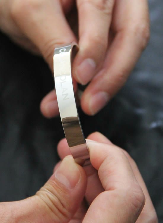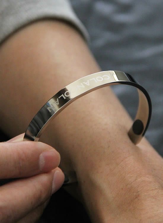 写真のモデルは手首回りが『16㎝』でピッタリでした。コランコラン製品でMサイズやLサイズをご利用のお客様は問題なくお使い頂けるサイズです。バングルなので本体の間口を広げたり狭くすることで若干のサイズ調整はできますが、 過度に広げたり狭めたりすると金属が変形したりヒビが入る事があります。
