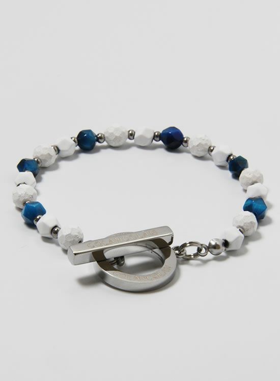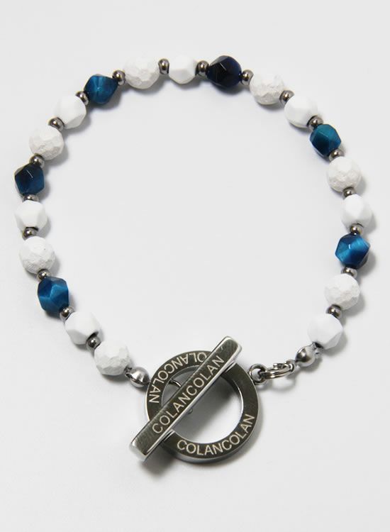ホワイトの石にブルータイガーアイを組み合わせた【FORCE3ブレスレット】です。写真を良く見て頂くとわかるのですがコランコラン独自のマイナスイオンを放出する鉱石と天然石を交互に入れる事で光が当たった時の反射する角度が変わり、さらにブルータイガーアイの爽やかさをプラスした個性的なブレスレットになりました。