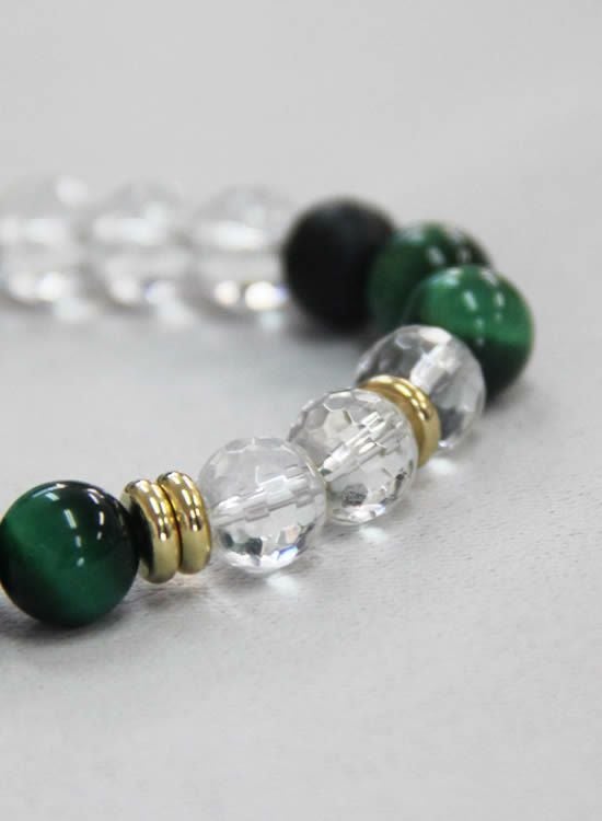 数量限定テスト販売FORCE4ブレスレット・水晶&グリーンタイガーアイ 【伸ばして脱着するゴムを使ったブレスレット】