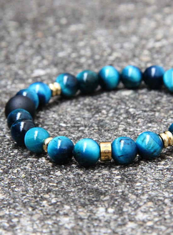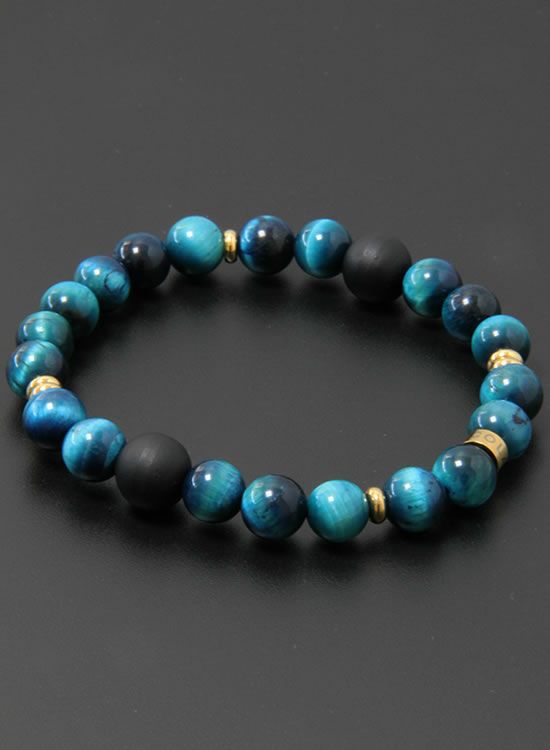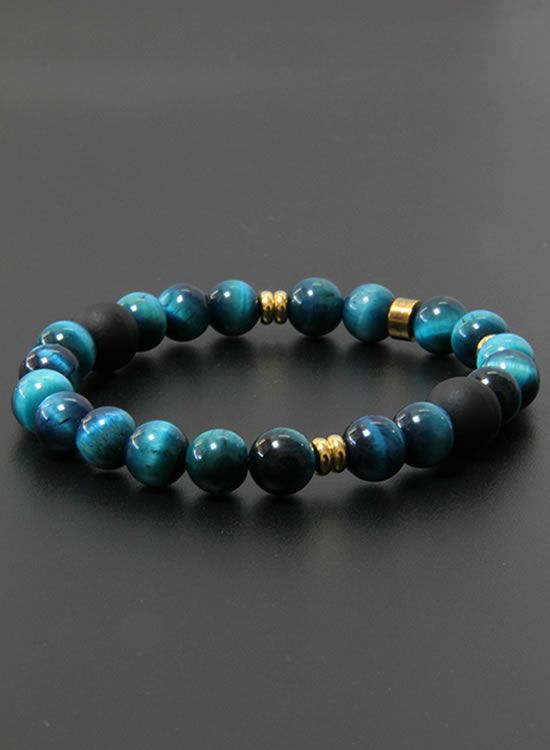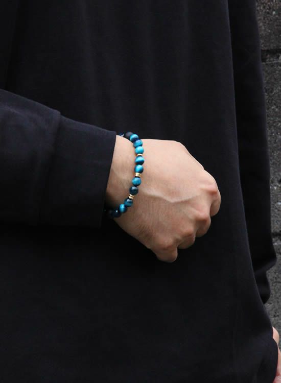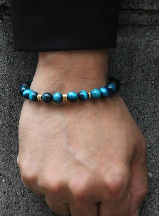 いつものFORCE4シリーズは10mm玉だけど8mm玉にしても男性が格好良く着けれるブレスが出来るんじゃないかと挑戦してみました。人気のブルータイガーアイの8mm玉とゴールドのパーツの相性が抜群です。