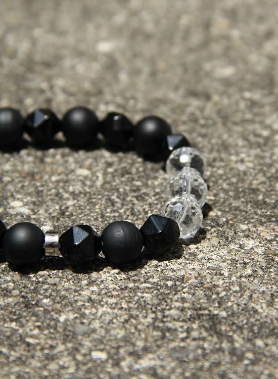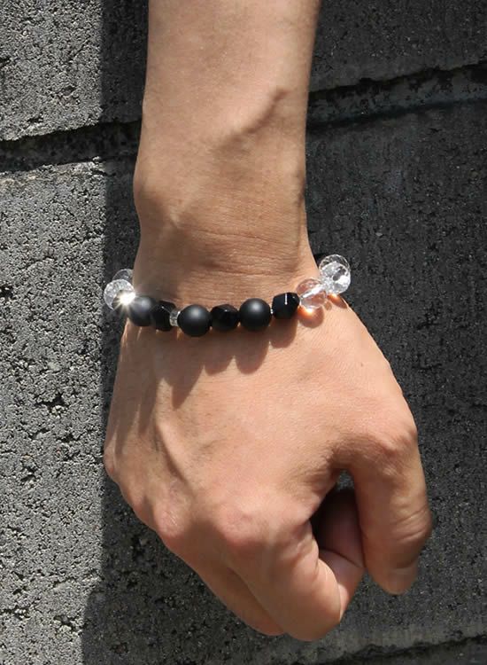 夏に黒いブレスレットを着けたいけど真っ黒だとチョット重めなので、涼し気に爽やかにブラックブレスを着けたいと思って水晶を入れてみました。夏の強い日光が水晶に反射して凄くキレイ!!実は試作段階ではもう少し少なかったんですがキラキラが涼し気だったので急遽増やして今の形に仕上がりました。