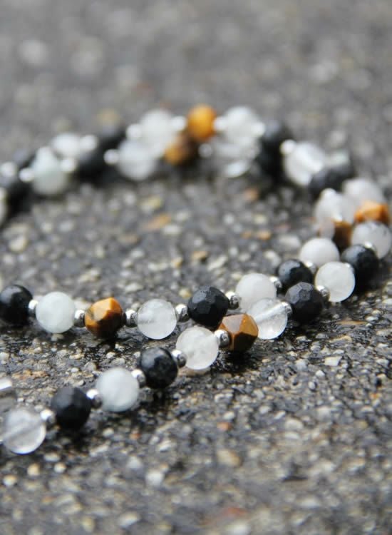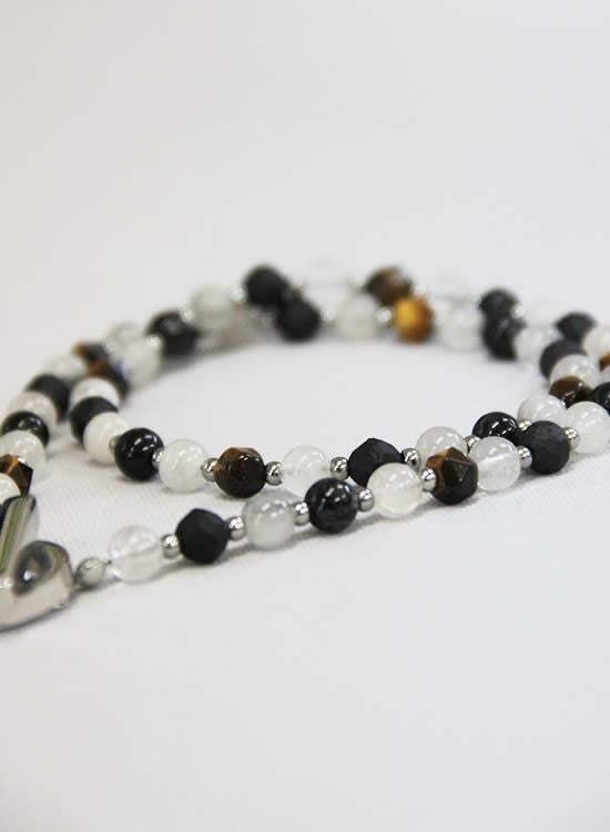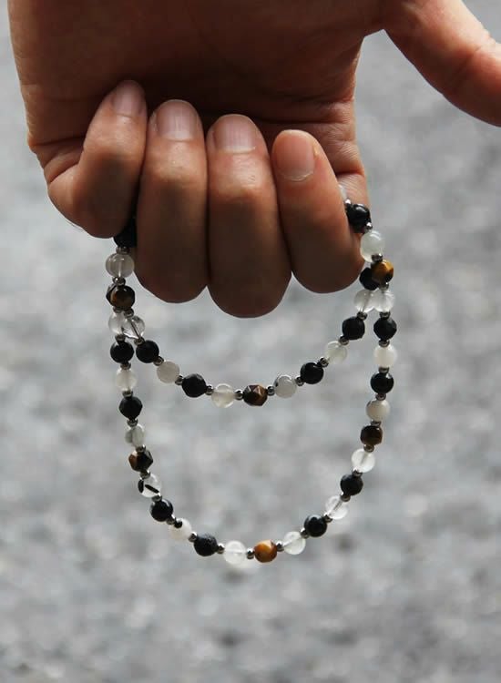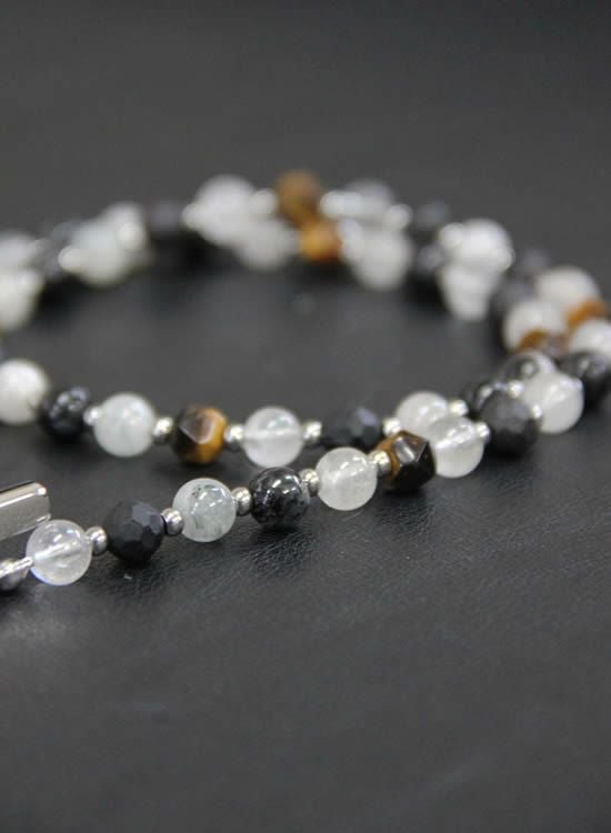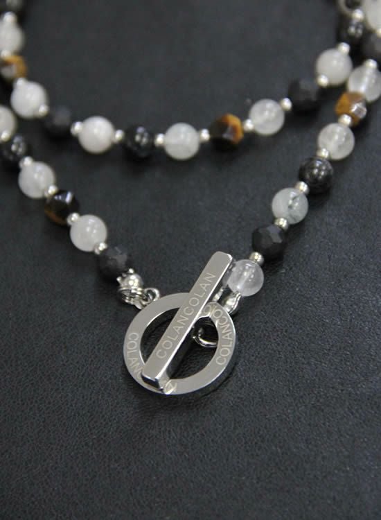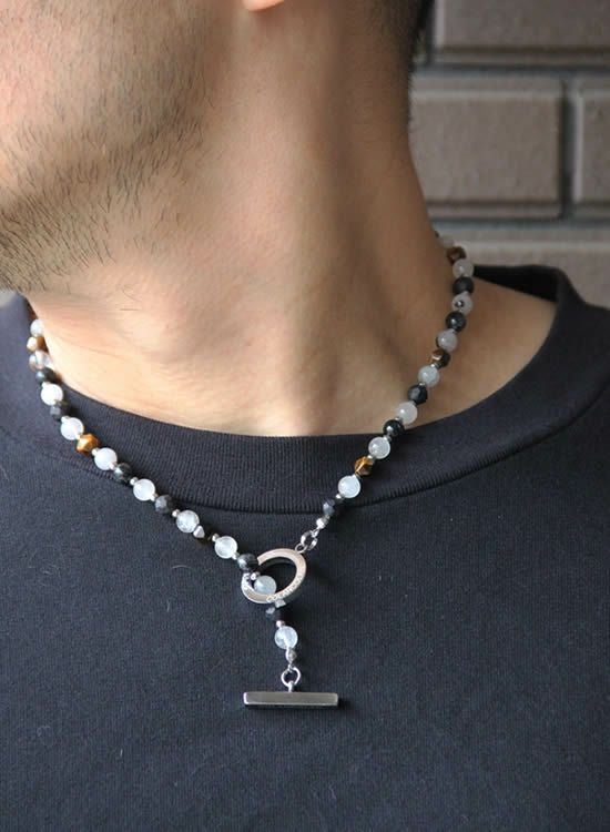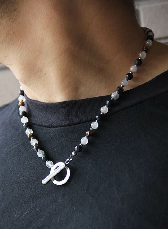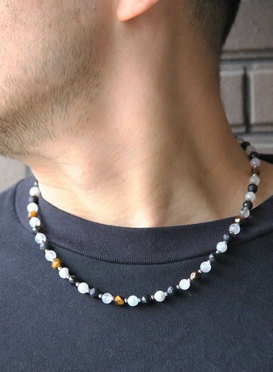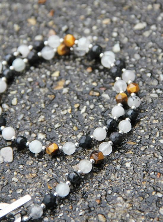ブラックルチルのマダラ感と半透明な色を生かしてネックレスを作ってみました。白じゃなくて薄いグレーみたいな色が爽やかでカッコイイです。また、色のバランスを安定させる為に角・タイガーアイも入れています。コレがまたアクセントになってカッコイイんです!!