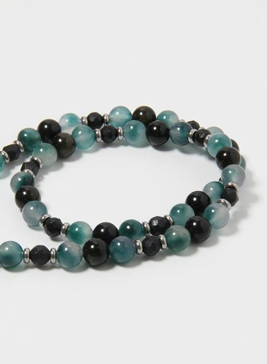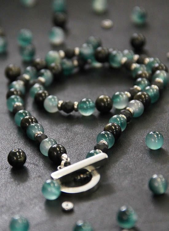 ブレスレットでも人気だった『翡翠』をネックレスにしてみました。ネックレスは黒系が人気なのは分かるんですが!それだとオモシロクナイので翡翠のような爽やかブルーを最大限生かせるように『黒曜石』も入れながらネックレスを組みました。今までにないカラーのネックレス誕生です!!