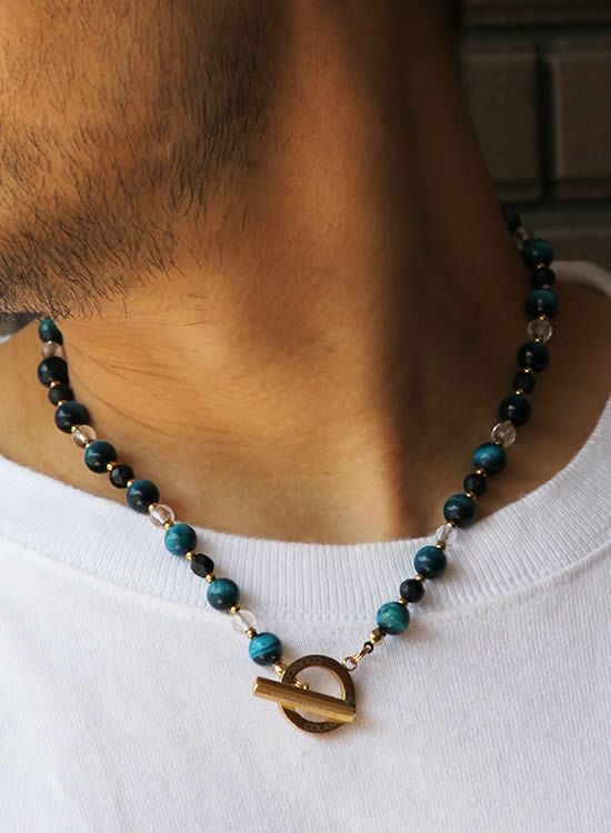 最近はちょっと大き目の8mm玉が人気なので、ブルータイガーアイと水晶を使って爽やかにネックレスを組んでみました。パーツもゴールドにしてあるので高級感も出るように仕上げました。水晶が入る事で一気に華やかになりネックレスとしても使いやすい!水晶の部分はTシャツの色に影響されるので黒Tでもカッコイイんですよ!!ぜひ!色々な服に合わせて使ってみてほしい!