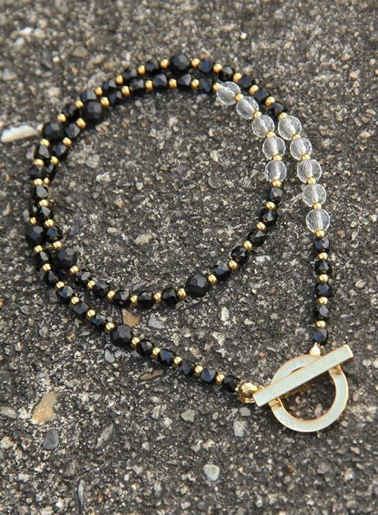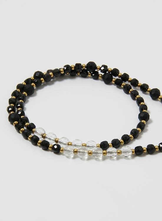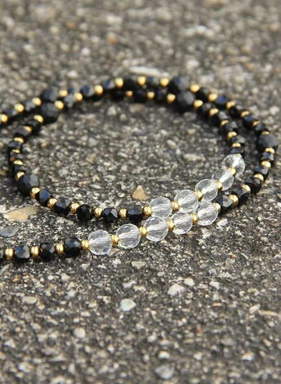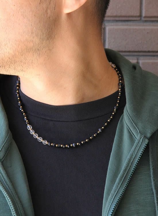 4mmのブラックスピネルをベースに水晶をワンポイントに使ったネックレスです。なぜ?水晶を使ったのか?色々と組み合わせてみたのですが、水晶なら下に着る服の色が映し出されるので冬に何を着てても楽しくネックレスを合わせてもらえると思い水晶をチョイスしました。使ってて楽しいネックレスです。