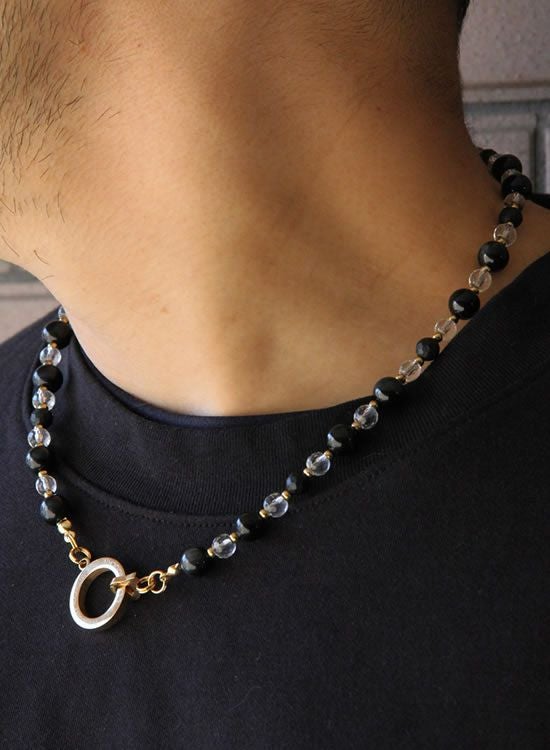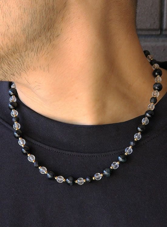 フォース5では新しいパーツを採用していて、これまでの輪っかに棒を通して引っ掛けるパーツから、輪っかにカチッと固定できる新パーツを採用しております。ブレスレットでも人気の『ブラックタイガーアイ』を使ったネックレスです。水晶を入れることでネックレスの下に着るTシャツ等の色が反映されるのでTシャツの色次第で印象が変わって凄く楽しいんです。