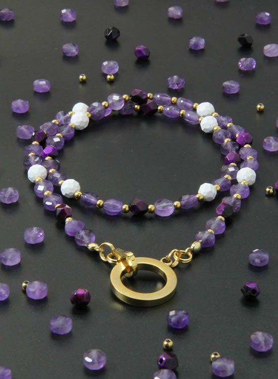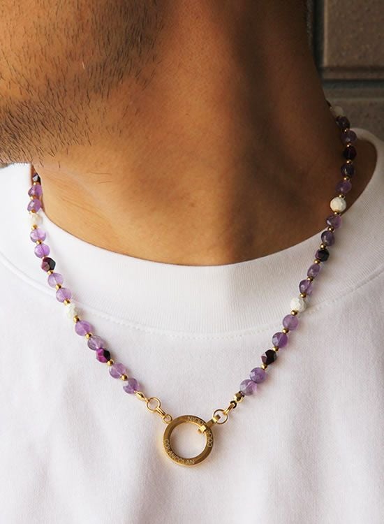 暖かくなったらアメジストでしょ!このすごくキレイなパープルは最高に爽やかカッコイイと思う。今回のネックレスはアメジストの中に数個だけ6mm角・パープルタイガーアイを入れているので、それがまたデザインをキュッとまとめてるんですよねぇ~。夏の白Tシャツにバッチリハマる1本です。