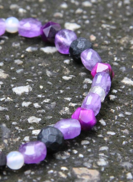 反射角度が変わって表情が出るのがファセット多面カットのアメジストをデザインしてみました。キレイな紫をもっとキレイに見えるように6mm角パープルタイガーアイを散りばめています。コレくらい元気な色をドンドン使って欲しい!