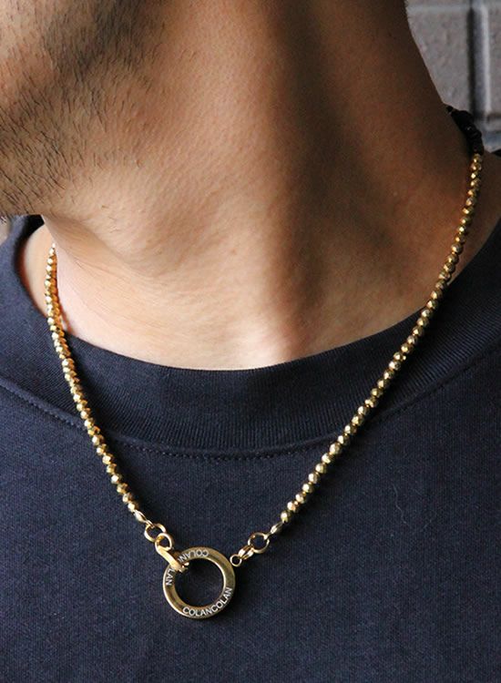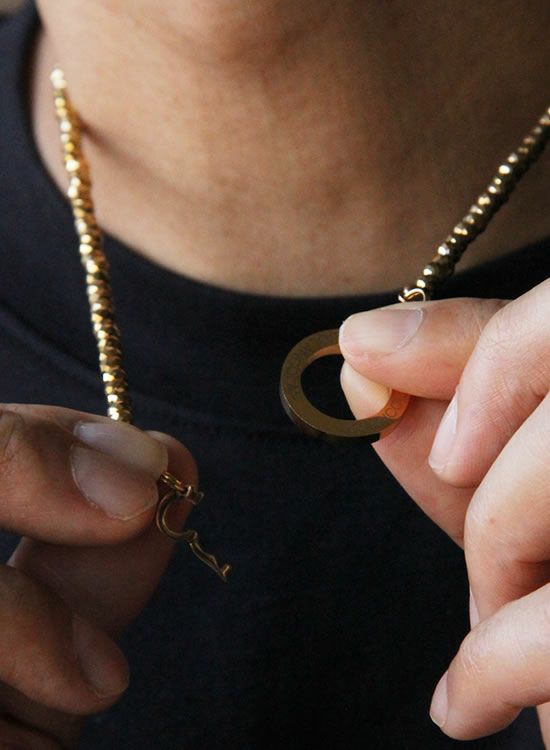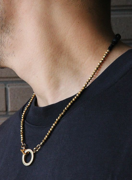 ヘマタイトと言う石にゴールドの塗装がしてあります。キラキラだけど石シリーズで初めてのネックレスは4㎜ゴールドのツートンブラックにしました。前と後ろで2種類の使い方も嬉しいし!ツートンを改めて作ってみて思いました!これはカッコイイです!!ぜひコランコランFORCEシリーズのゴールドネックレスを楽しんで欲しい!!