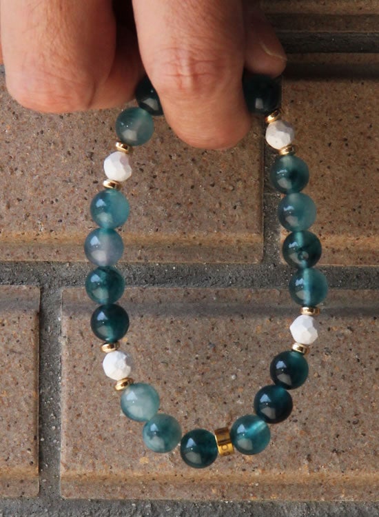 石自体が小さいのでゴムを通す穴も小さくなってしまいます。通常のFORCE4の10mm玉ブレスレットに比べて通しているゴムが細くなっている為にゴムの強度を確保できませんでした。それでもゴムタイプが楽で使いやすいのが魅力で商品化に至りました。