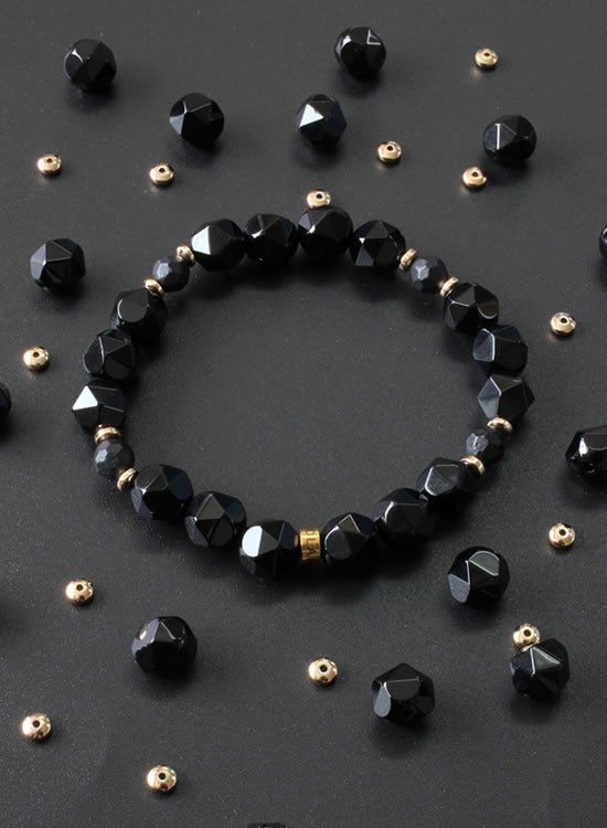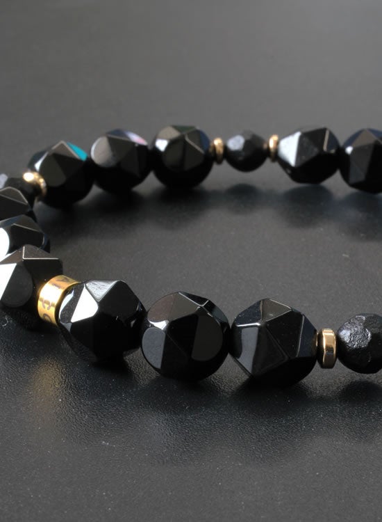 丸石に飽きたら角石はいかがでしょうか?10㎜の角オニキスをブレスレットにしてみました。丸いブレスレットとは印象が全然変わりますよね。角石のブレスレットはあまり出回ってないのでインパクトはあるかもですね。ぜひ挑戦してみて下さい。