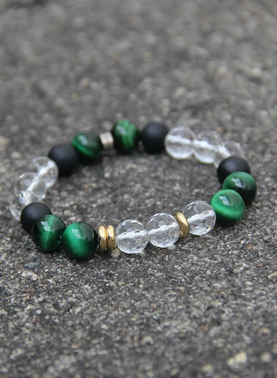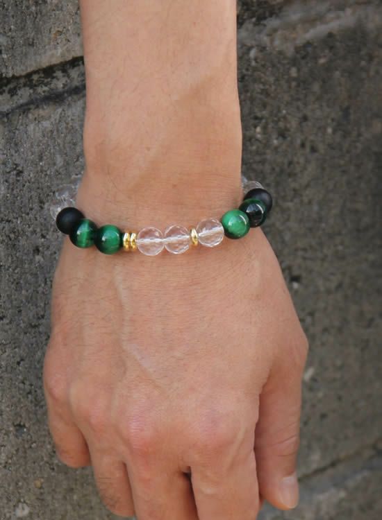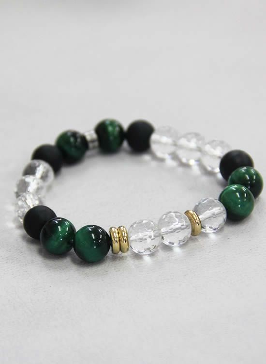 数量限定テスト販売FORCE4ブレスレット・水晶&グリーンタイガーアイ 【伸ばして脱着するゴムを使ったブレスレット】
