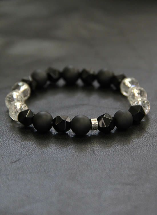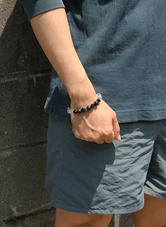 夏に黒いブレスレットを着けたいけど真っ黒だとチョット重めなので、涼し気に爽やかにブラックブレスを着けたいと思って水晶を入れてみました。夏の強い日光が水晶に反射して凄くキレイ!!実は試作段階ではもう少し少なかったんですがキラキラが涼し気だったので急遽増やして今の形に仕上がりました。