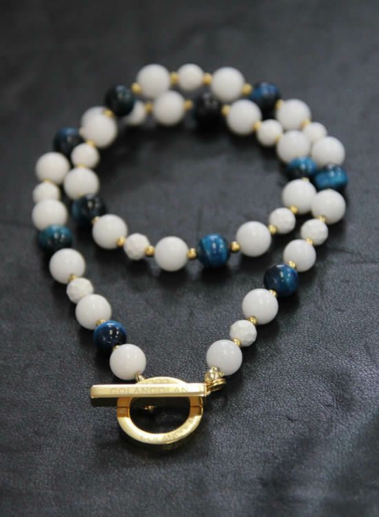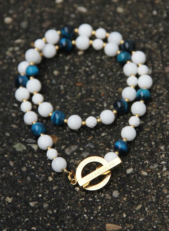 8mm玉を使ったネックレスが凄く好評だったので、夏らしくホワイトのネックレスも作りたくなって挑戦しました。ホワイトジェイドだけだと面白味が無かったので夏らしくブルータイガーアイを散りばめました。最近、こういう大き目の石を短めのネックレスで着けるのも流行ってるみたいなので挑戦してみて欲しい。