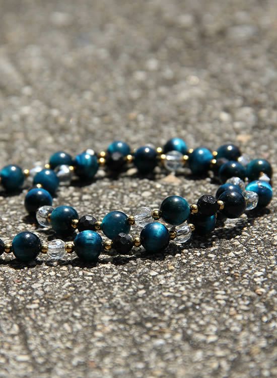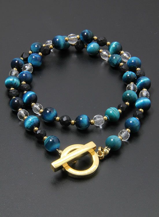 最近はちょっと大き目の8mm玉が人気なので、ブルータイガーアイと水晶を使って爽やかにネックレスを組んでみました。パーツもゴールドにしてあるので高級感も出るように仕上げました。水晶が入る事で一気に華やかになりネックレスとしても使いやすい!水晶の部分はTシャツの色に影響されるので黒Tでもカッコイイんですよ!!ぜひ!色々な服に合わせて使ってみてほしい!