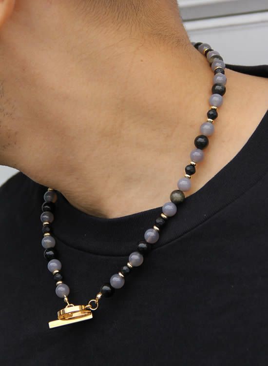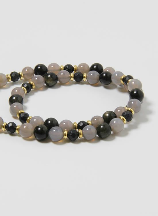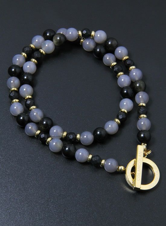 【FORCE3】 8mm黒曜石&グレーアゲート(ゴールド・ブラック) ネックレス