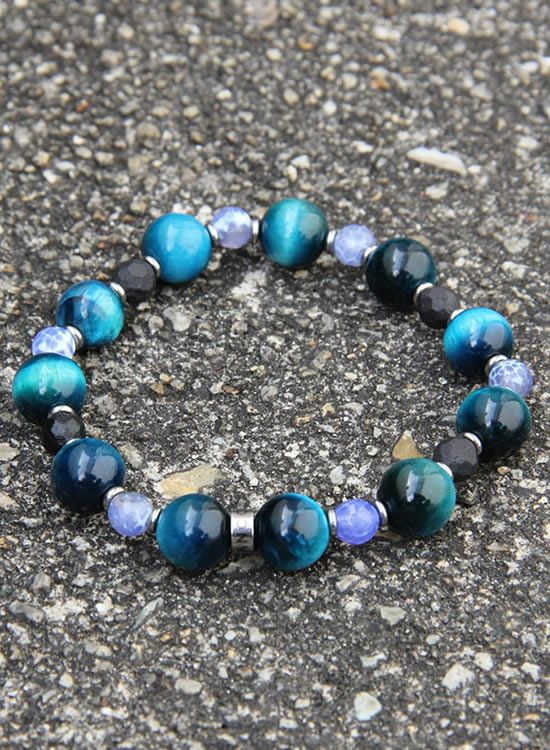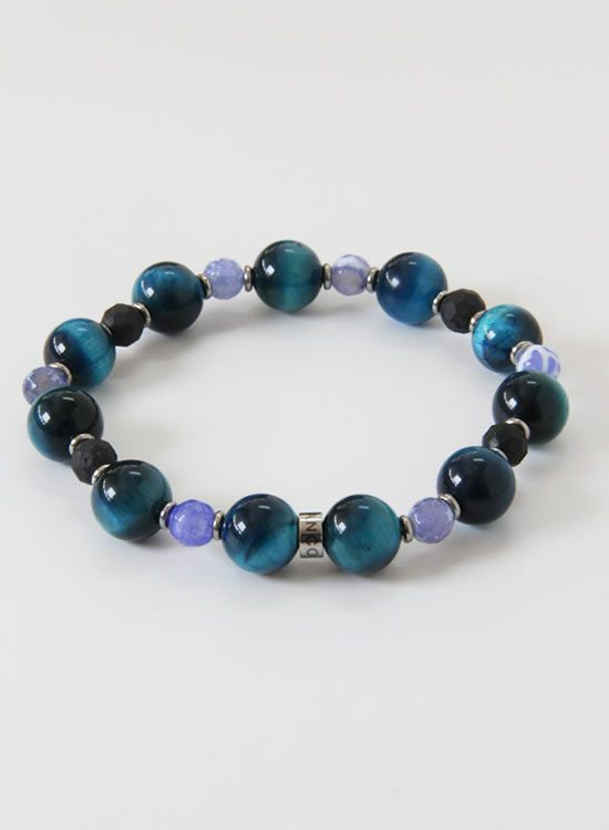 10mmのブルータイガーアイを使ったブレスレットはコランコランでも沢山の種類を作っているのですが、まだまだ出ちゃう!!今回は6mmのブルーファイヤーアゲートと一緒に組んでみました!パッと見は夏っぽい!!シルバーのパーツと合わせる事で凄く爽やかなアクセに仕上がっています。どんなシーンでも着けやすそうです!!