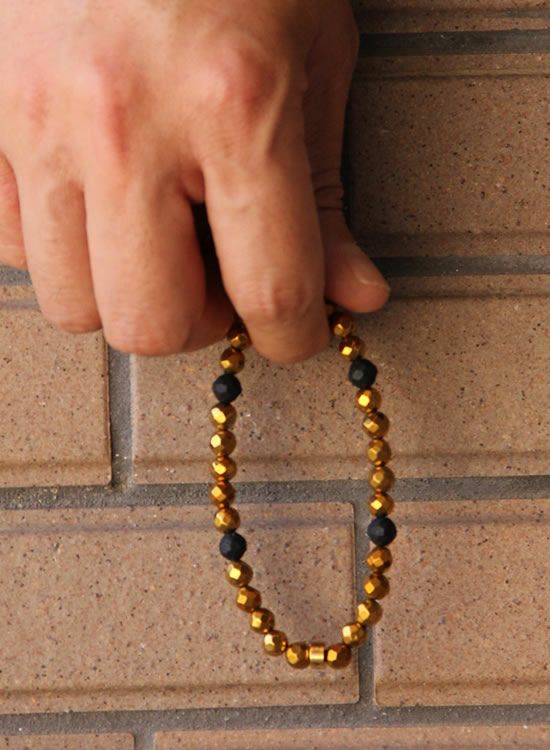 金属に見えるけど実は石なんです!ヘマタイトと言う石にゴールドの塗装をしてあります。今回はそのゴールドヘマタイトをメインに使ってキンキラアクセに見えるようにブレスレットを作ってみました。こう見えてシッカリとCOLANCOLANなのでマイナスイオンもシッカリ出てます。こういうの待ってた人も多そう♪