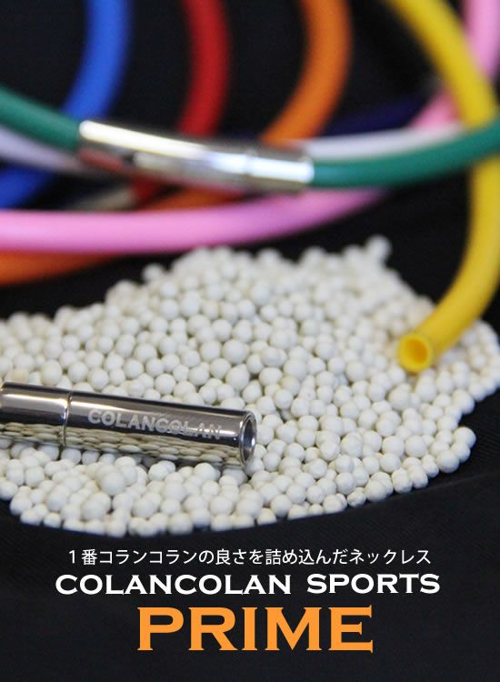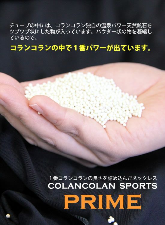 SPORTSプライムの最大の特徴は、この『つぶつぶ』です。今まではパウダー化した物を封入していましたが、『つぶつぶ』にした事により耐久力もあがりマイナスイオンの量も多く放出する事が出来るようになりました。コランコランの中で一番マイナスイオンの量を放出している商品が【プライム】になります。ウチの商品の中で最強の商品です。コランコランの天然鉱石パワーとの相性がいいお客様、またはプロアスリートでワンシーズンだけ集中して着けたいと言う方にオススメです。