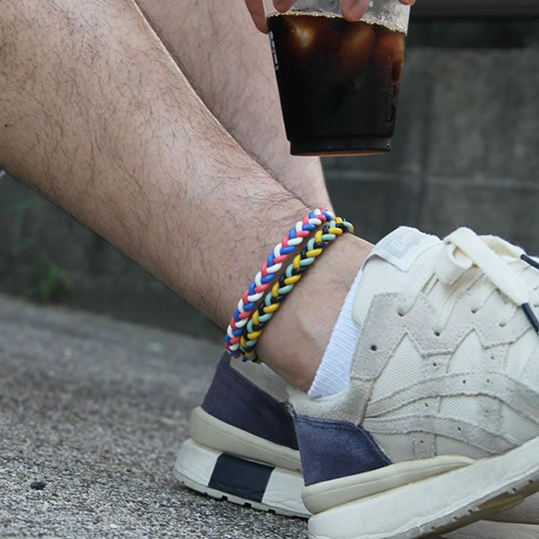 天然鉱石含有シリコンゴム、PP 重さ約14g~(サイズによって変動します。)水・汗に強いのでお風呂も着けたままで大丈夫。